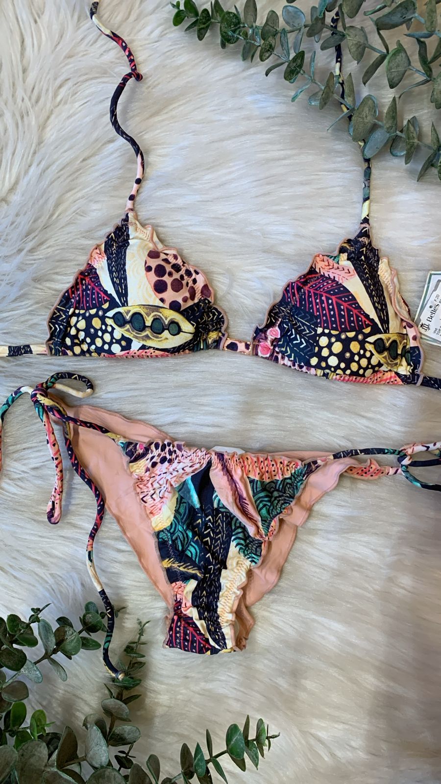 TAMANHO DISPONÍVEL: PESTAMPA: Tons de rosé, preto e bege com detalhes orgânicosMODELO: Top cortininha com bojo leve + calcinha com...
