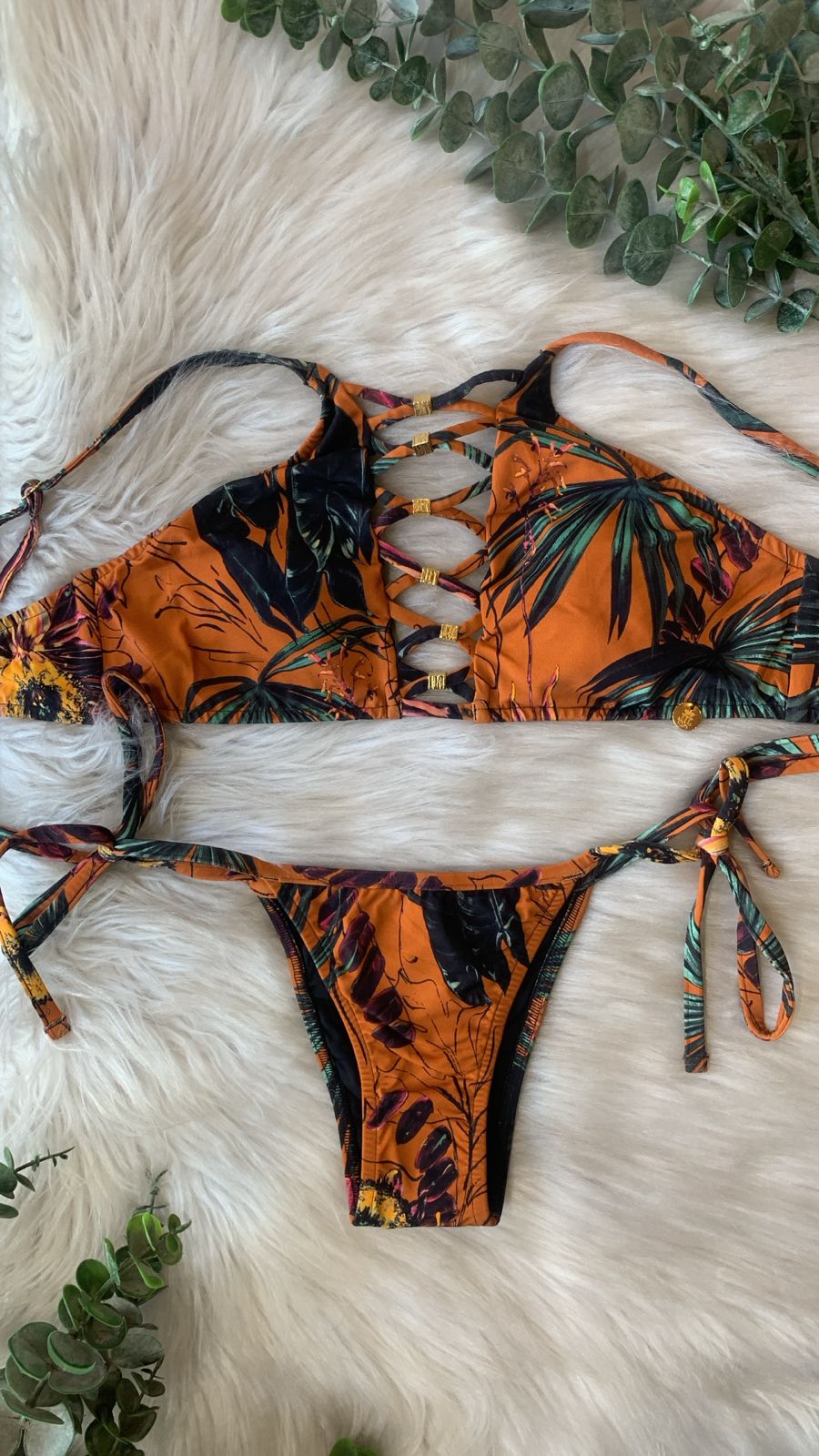 TAMANHO: PESTAMPA: Tropical em tons terrosos (laranja, marrom e verde)MODELO: Top estruturado com bojo + calcinha de amarração lateral DESIGNO...