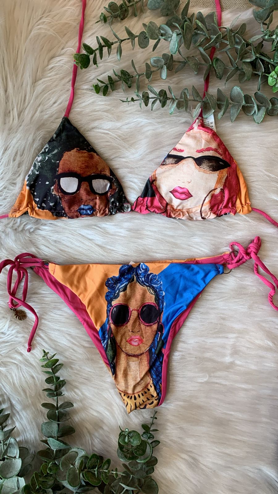 TAMANHO DISPONÍVEL: GESTAMPA: Ilustrações femininas estilizadas em rosa, laranja, azul e pretoMODELO: Cortininha + calcinha com amarração lateral DESIGNO BIQUÍNI...