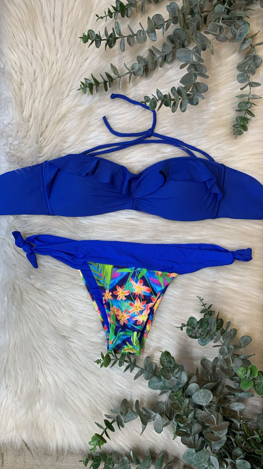 TAMANHO: PCOR: Top azul royal + calcinha tropical multicoloridaMODELO: Tomara que caia + calcinha lacinho DESIGNO BIQUÍNI DECHELLES combina elegância...