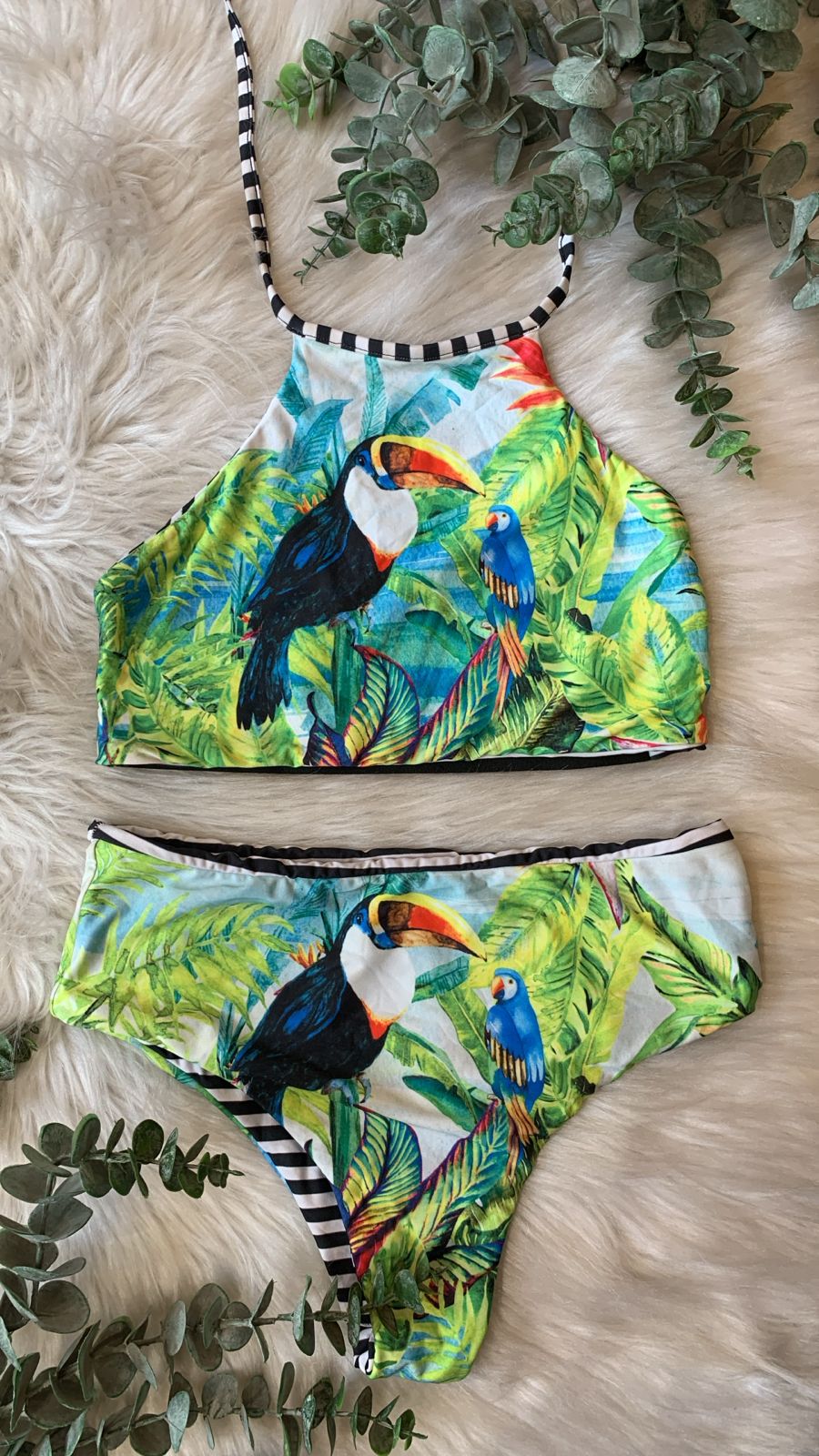 TAMANHO: MCOR: Estampa tropical multicoloridaMODELO: Top cropped frente única + calcinha tradicional DESIGNTropical, alegre e cheio de personalidade, esse biquíni...