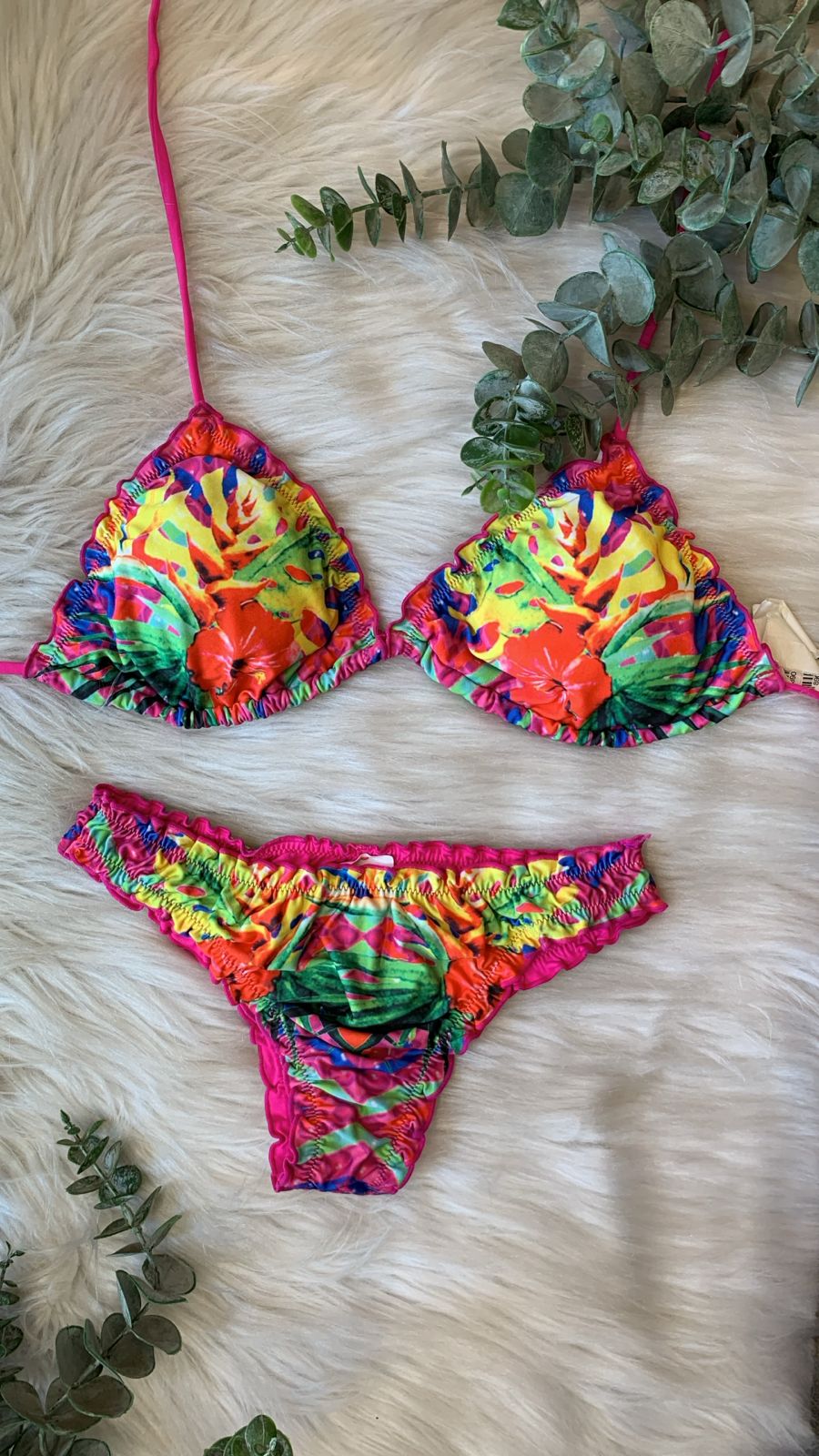TAMANHOS:• Parte de cima: G• Parte de baixo: M ESTAMPA: Tropical multicolorida (rosa, verde, amarelo e laranja)MODELO: Cortininha + calcinha...