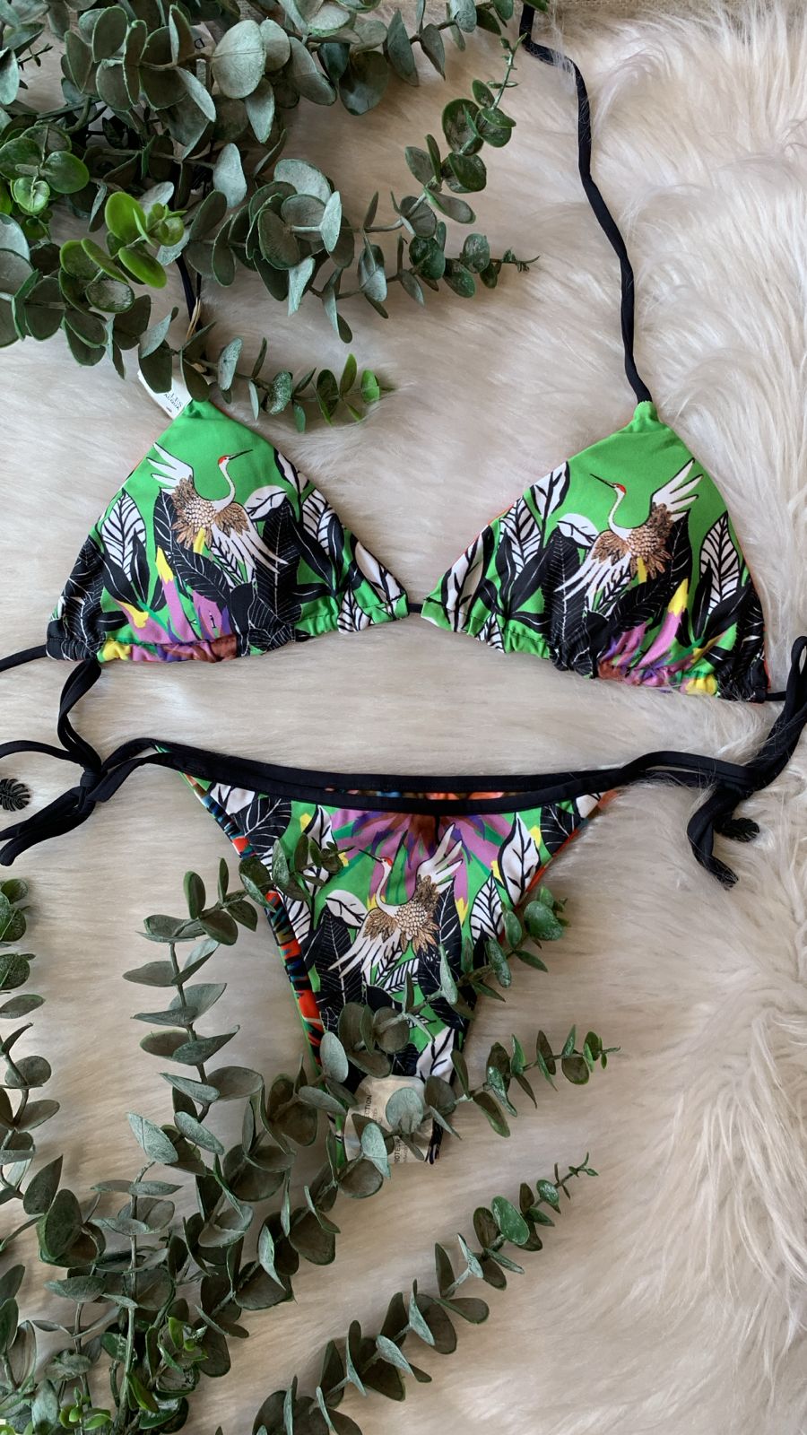 TAMANHO: MCOR: Verde, preto, branco e detalhes coloridosMODELO: Cortininha + calcinha lacinho DESIGNVibrante e moderno, esse biquíni traz uma estampa...