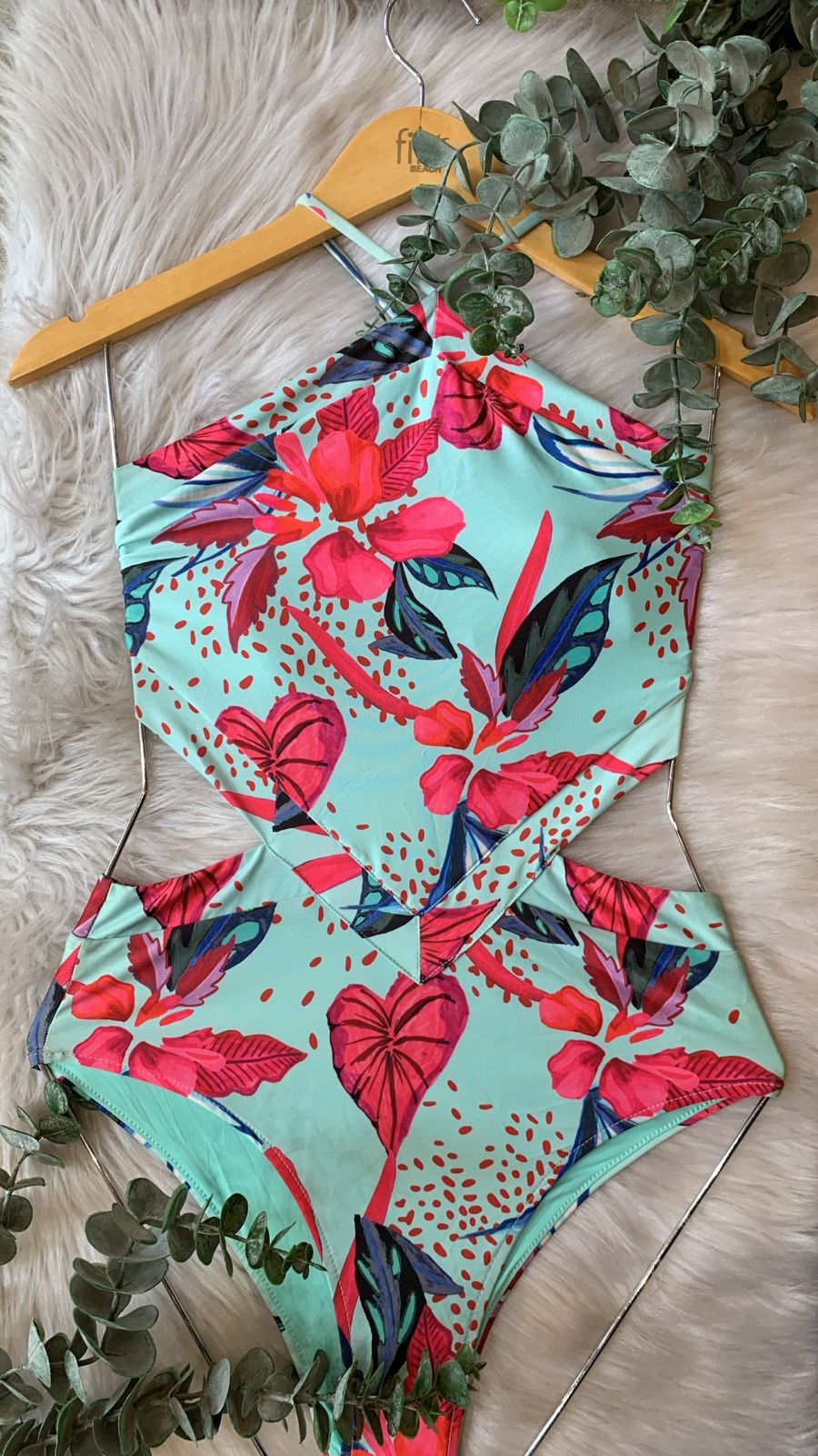 TAMANHO: MCOR: Floral tropical em pink, vermelho e azul sobre fundo verde águaMODELO: Frente única com recorte frontal DESIGNModerno e...